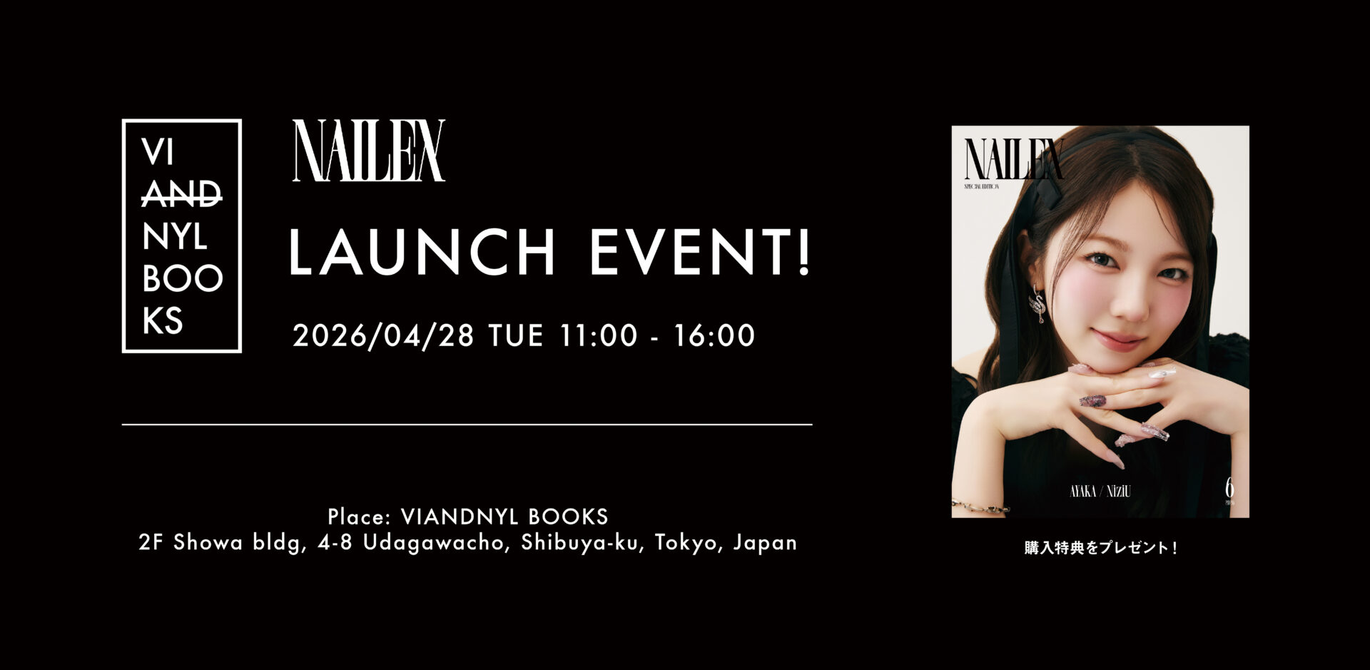 『NAILEX 6月号 SPECIAL EDITION』(AYAKA / NiziU)ver.が予約開始から大反響につき、東京・渋谷の書店「VIANDNYL BOOKS(バイアンドナル ブックス)」にて、発売記念企画を4月28日(火)限定で開催!