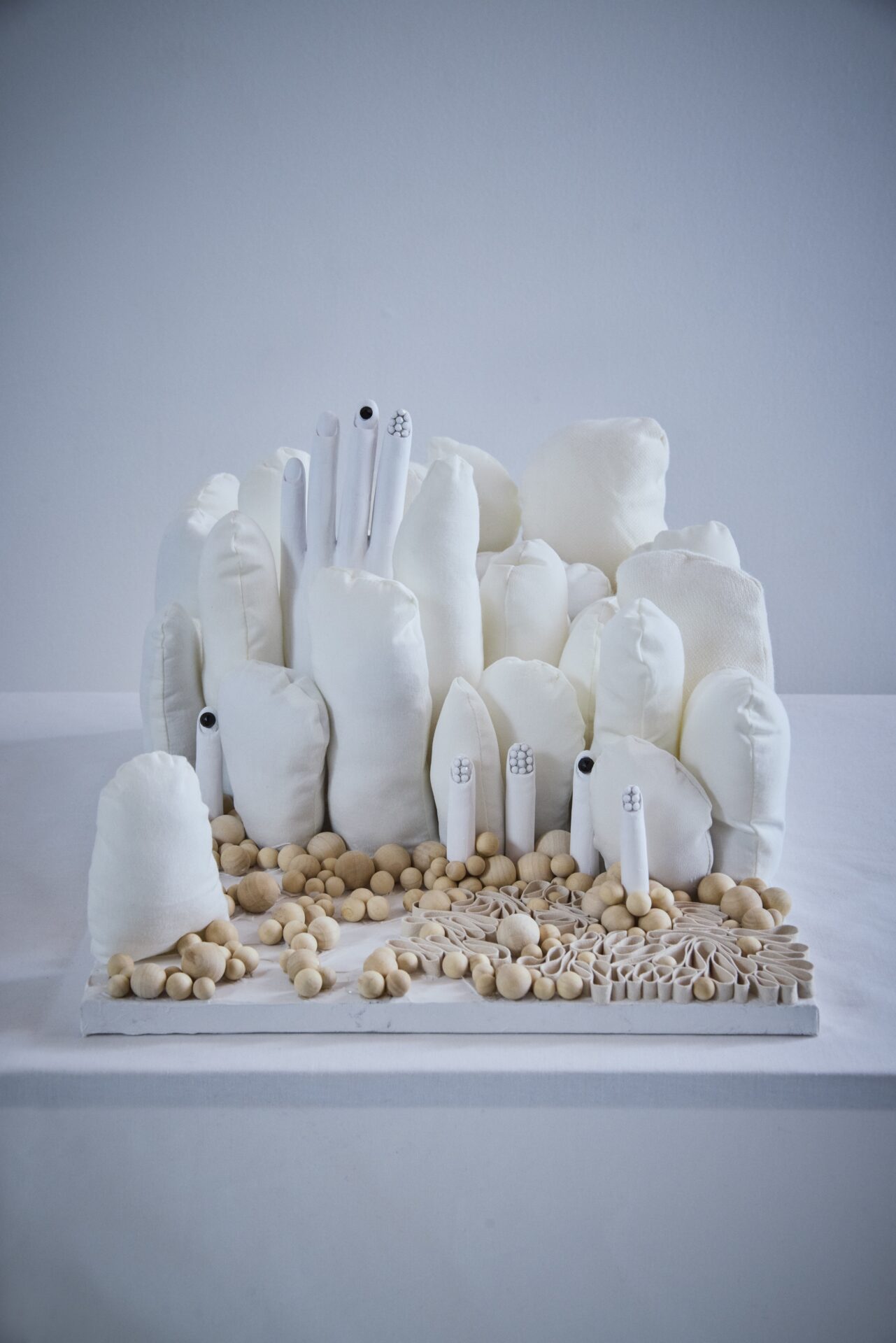 感情や時間など何もないように見える中にある、微細な変化や存在感を素材の違い、白で無・余白を表現しました。上から横から斜めからと角度を変えて見ると違うものに見えるような楽しさも含めました。
